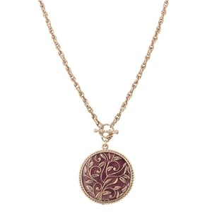 Luscious and merely a little longer than your average necklace, this matinee length pendant necklace shines inside a brilliant rose gold hue. the French rope style chain connects at a toggle clasp inside the front for any vintage edge. The round medallion measures 1 ½" in diameter and is decorated having an elegant floral pattern and amethyst purple enamel. Sleek and chic.
