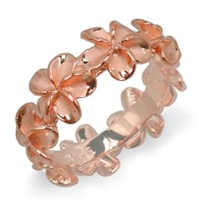 This plumeria eternity style ring is 8mm wide (5/16 associated with an inch), and is also made from sterling silver with a 14K rose gold finish. Flowers have a sandblasted finish with good polish petal tips.